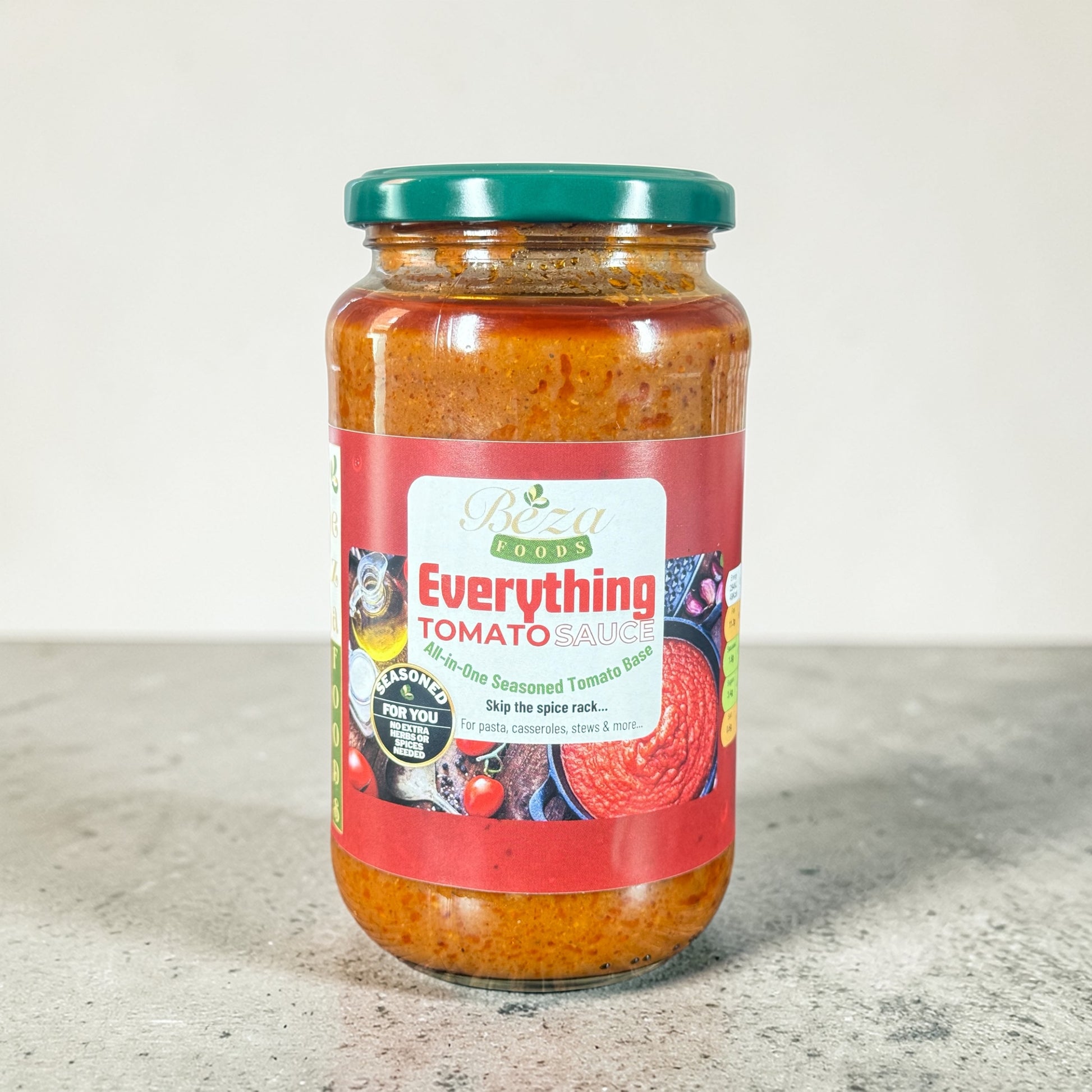 Beza Everything Sauce is your all-purpose seasoned tomato base for busy days and bold flavour. Slowly cooked with tomatoes, aromatics and our signature herb and spice blend, it's already seasoned so you can skip the spice rack and get straight to cooking. It's the kind of jar that earns its place in your kitchen because it works with almost everything.
