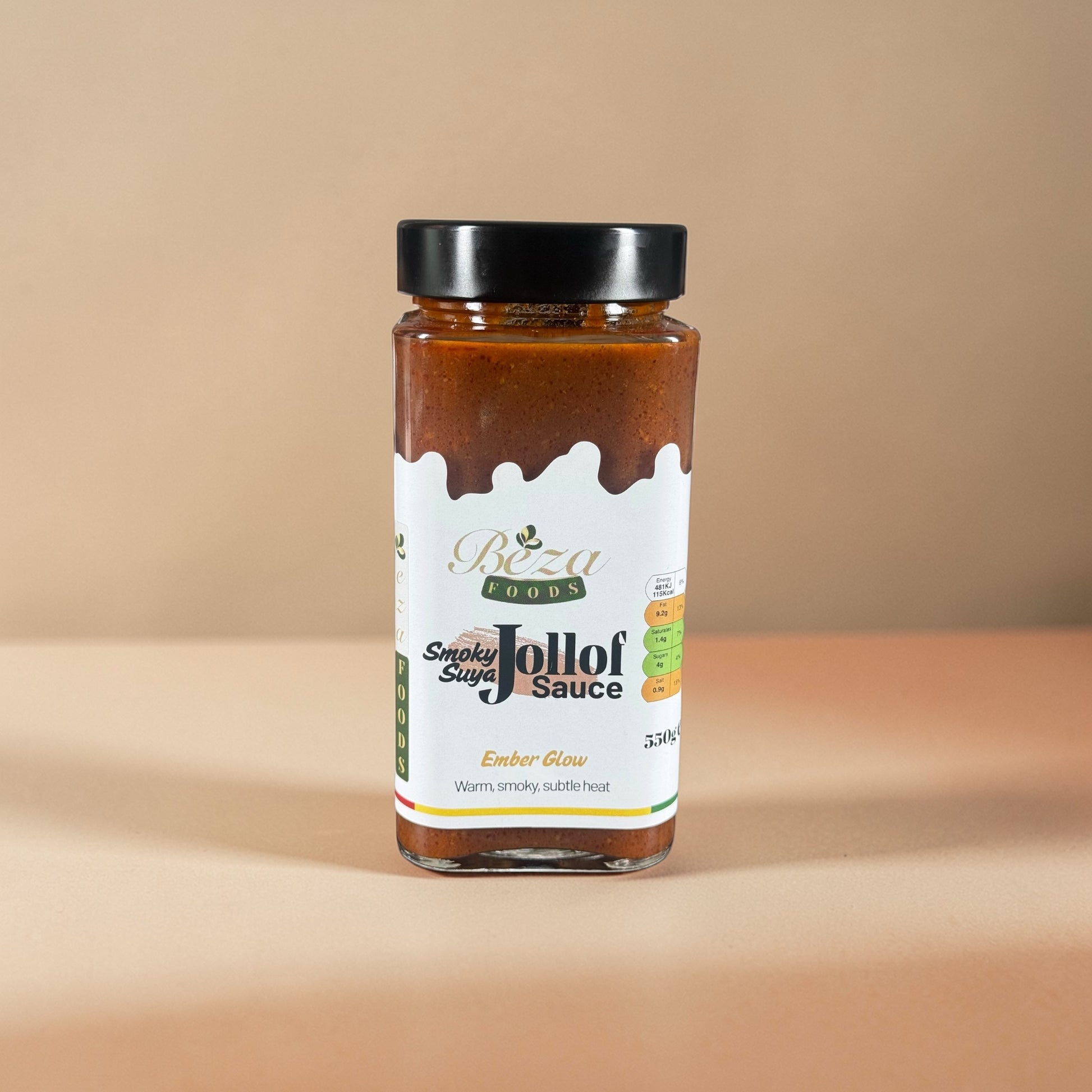 Beza Smoky Suya Jollof Sauce - Ember Glow is a Ghanaian-inspired tomato cooking sauce layered with deep, smoky suya spices and gentle chilli heat. Slow-simmered with tomatoes, onions, peppers and aromatics, it brings rich street-grill flavour to jollof rice and everyday cooking with very little effort.