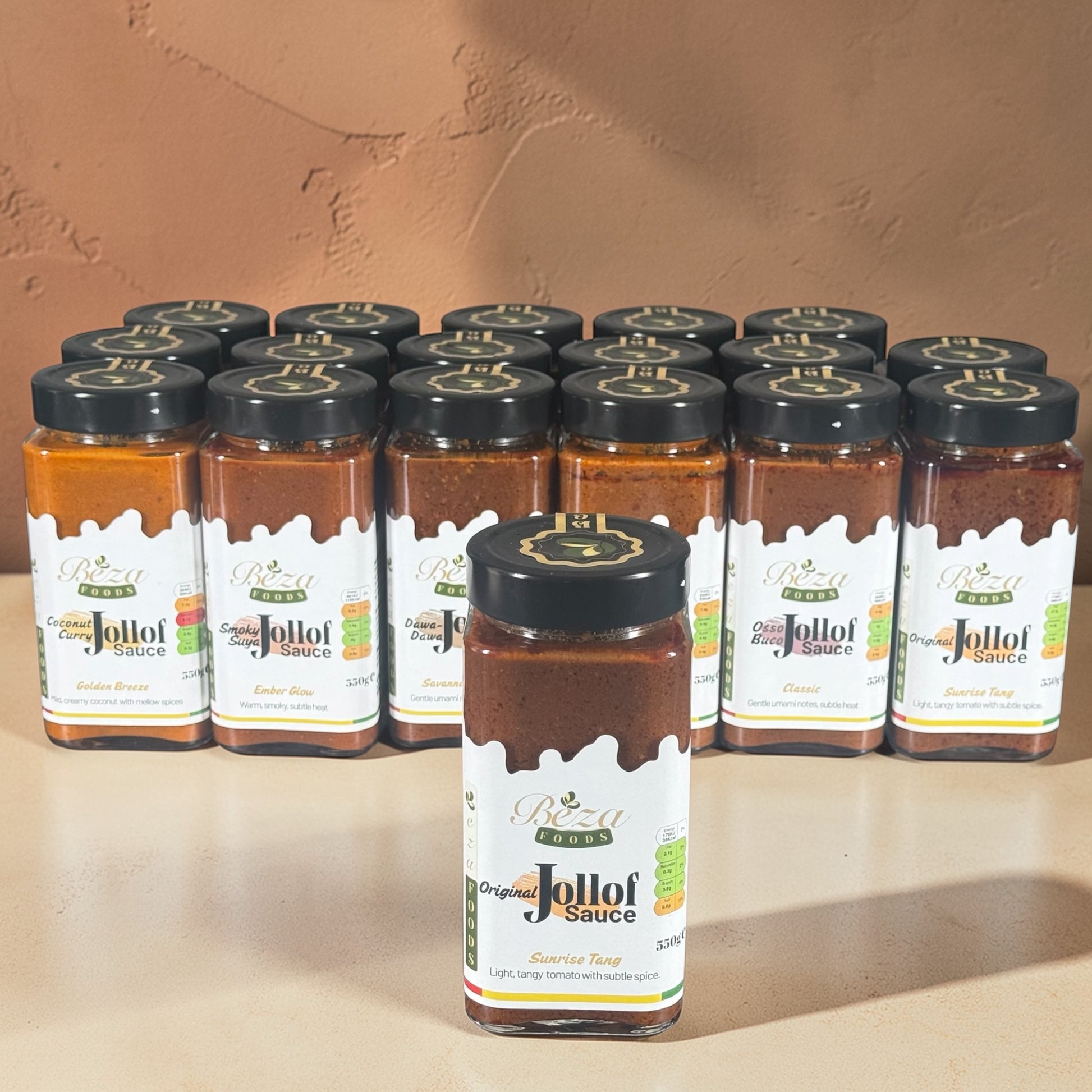 Beza Classic Jollof Sauce - Sunrise Tang is a Ghanaian-inspired tomato cooking sauce with a light tangy flavour and subtle spice. Slow-simmered with tomatoes, onions, peppers and aromatics, it is crafted to help you make party-style jollof at home with ease and no stress. Bright, balanced and familiar, it is the perfect place to start.