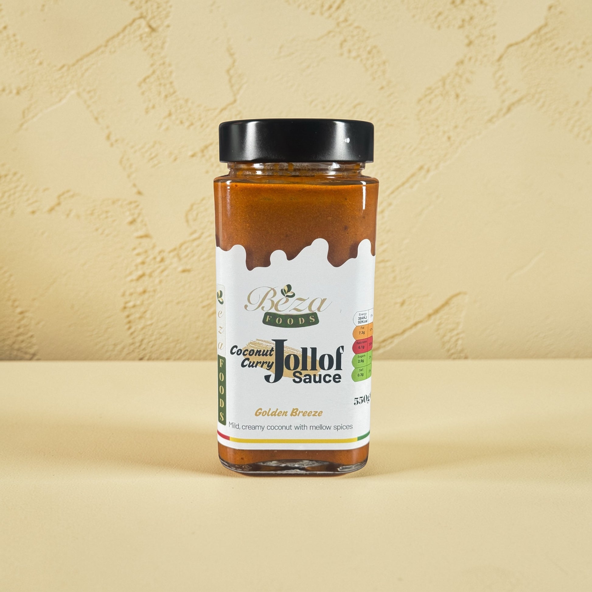 Beza Coconut Curry Jollof Sauce - Golden Breeze softens the bright tang of tomato with creamy coconut and gentle curry warmth. Fragrant, cosy and deeply comforting, it offers a beautifully balanced fusion of Ghanaian flavour and coastal spice. It is perfect for those who like their jollof with a softer, richer finish.